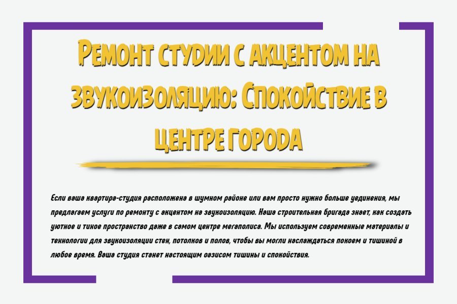 Создание спокойного и тихого пространства в студии, особенно в центре города, требует особого внимания к звукоизоляции. Уличный шум, соседи и другие городские звуки могут нарушать комфорт и мешать отдыху или работе. Ремонт студии с акцентом на звукоизоляцию позволяет создать уютное убежище, где можно расслабиться и насладиться тишиной. Рассмотрим основные аспекты, которые помогут вам достичь этого.
